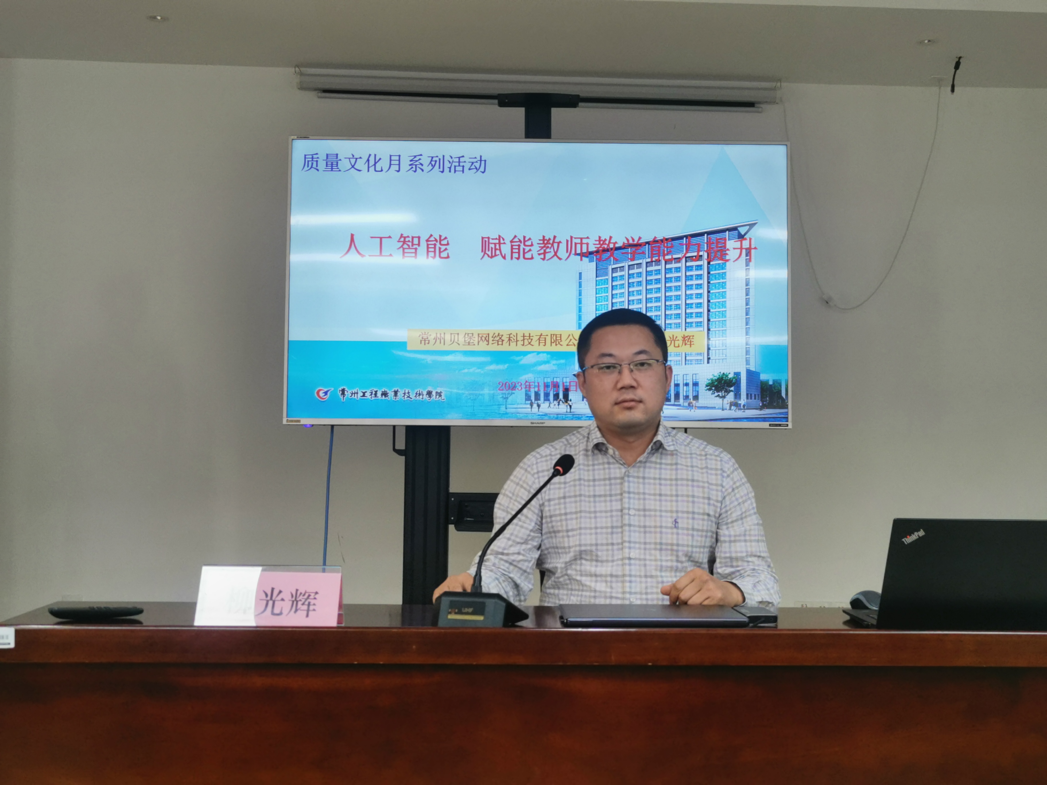 11月1日,经管学院2023年质量文化活动月正式启动,常州贝堡网络科技有限公司总经理柳光辉,为全体教师带来了题为《人工智能赋能教师教学能力提升》的讲座。