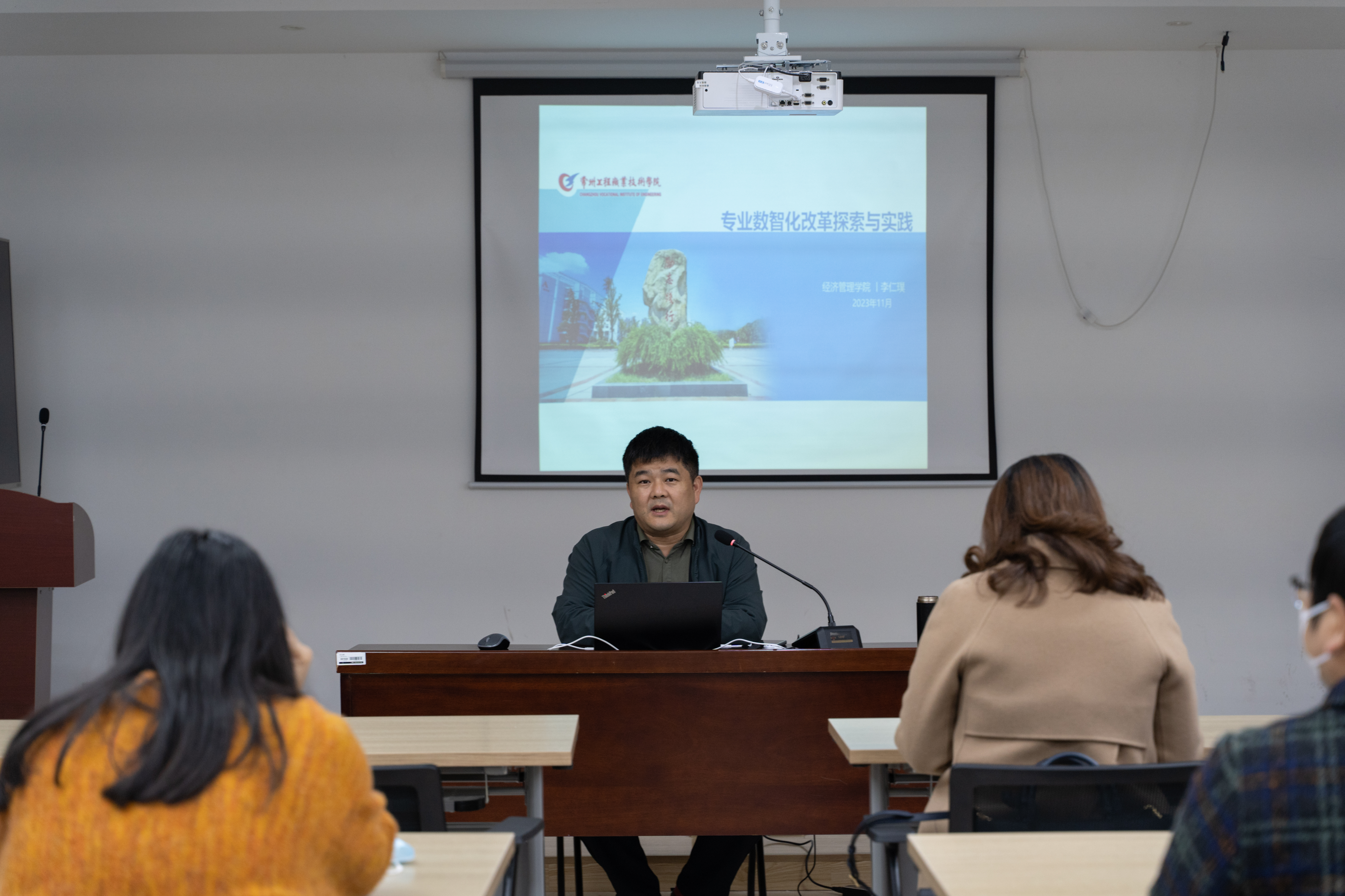 经管学院院长李仁璞给来访老师们作《专业数智化改革探索与实践》专题报告,随后带领老师们参观了大学生创业园、现代建筑科技馆和京东校园实训中心等实践实训场所。