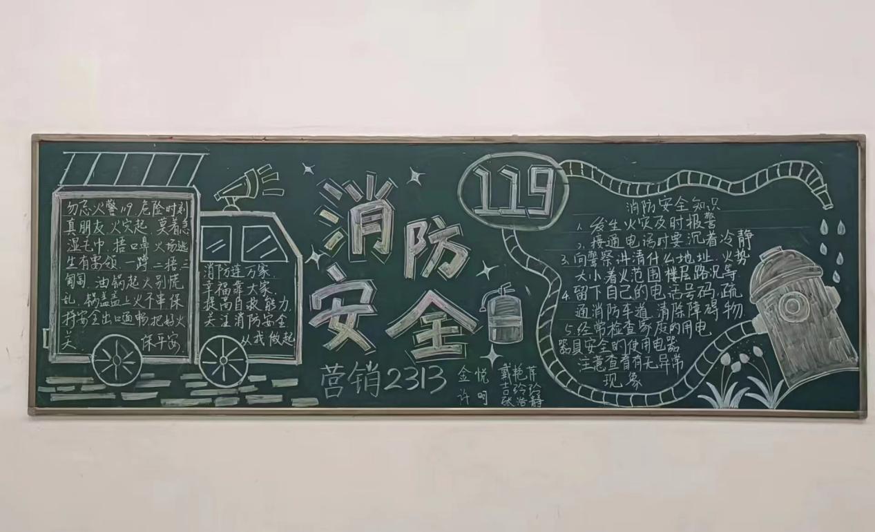 以评促建,增强安全育人实效。各班集思广益,设计”消防安全”主题黑板报,并积极参与学院评比活动。各班板报版面精美,内容丰富,有消防安全知识、自护自救方法、防火警示标记等。一张张黑板报犹如一套生动的消防安全教材,既达到宣传教育的目的,又为创造和谐校园增添了亮丽的色彩。