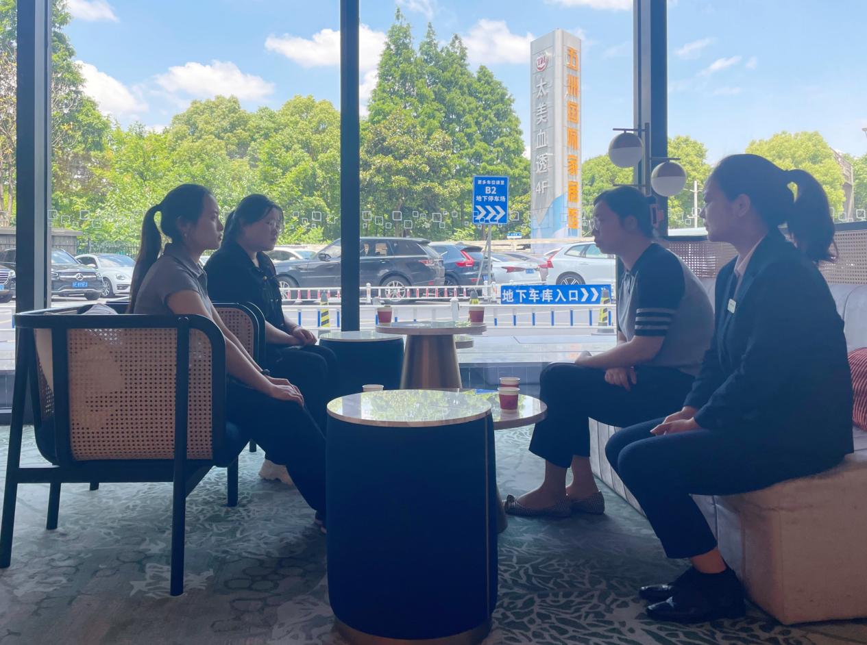 南通校友会会长、南通濠河景区希尔顿花园酒店董事长袁建安热情接待,他从希尔顿集团发展历史、南通濠河景区希尔顿花园酒店概况、经营业务、人才需求、企业文化以及酒店员工培养计划等方面进行了详细介绍。随后,在酒店方的陪同下,调研组一行参观了酒店的前台、自助餐厅、客房、健身房等功能区域,并与酒店相关负责人就专业建设、人才培养、实习与就业岗位拓展等问题进行深入交流。