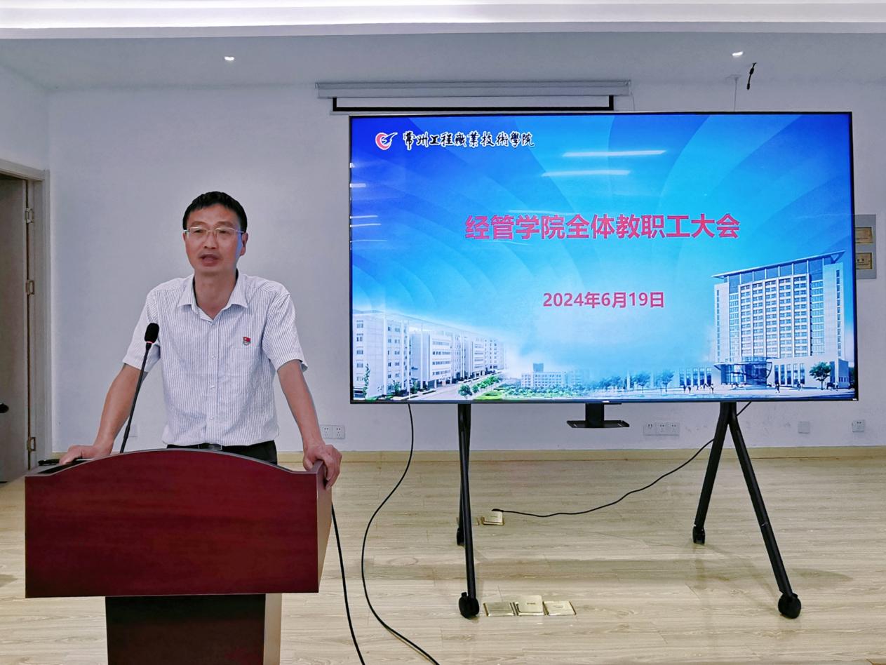 6月19日,91成人网全体教职工会议在合一楼C303会议室召开。本次大会旨在部署期末教学、毕业生就业以及学生实习单位落实等重点工作,经管学院领导班子成员及全院教职工参加会议,会议由党总支书记徐标主持。
