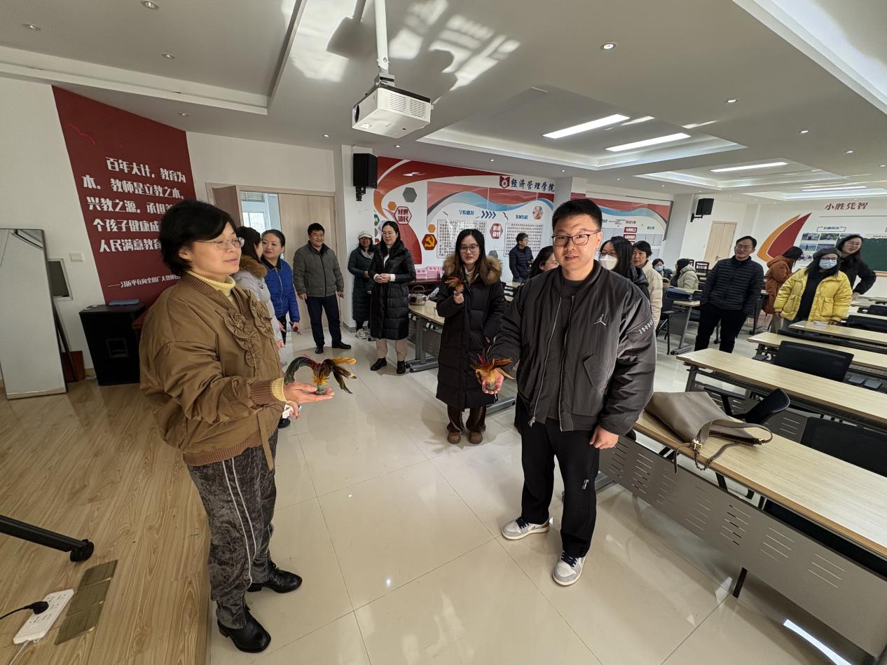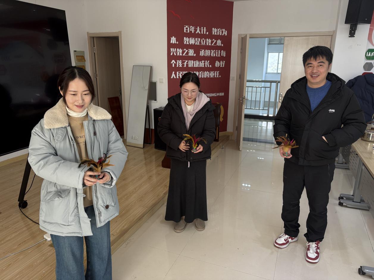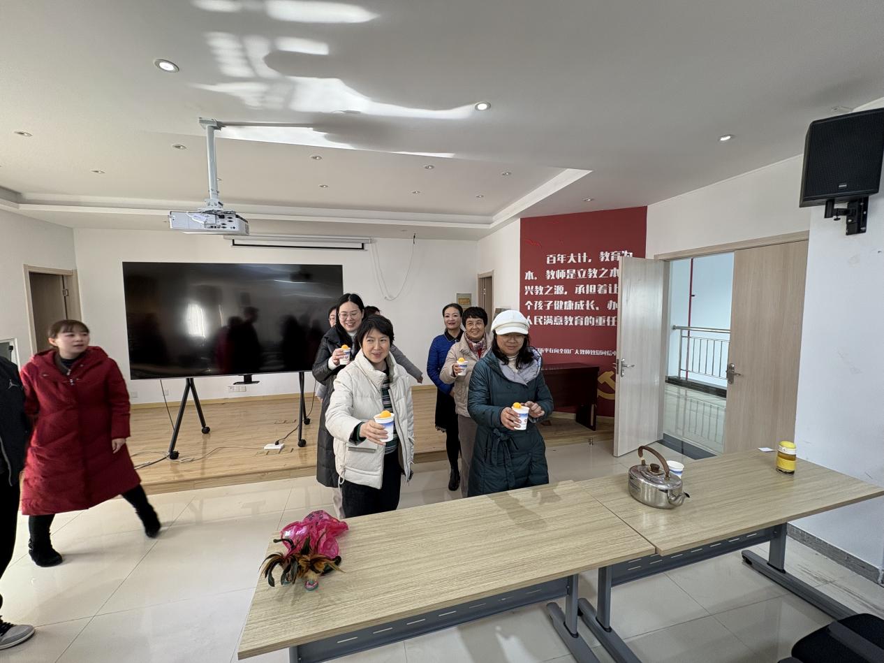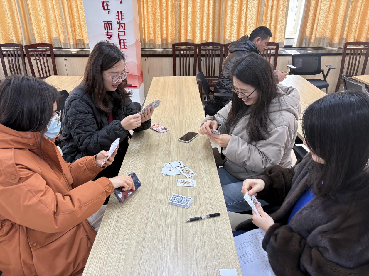 大扫除结束后比赛项目随即展开。首先是踢毽子比赛,四支队伍各选派3名精兵强将组成小队,展开了一场激烈的角逐。毽子在队员们的脚下灵巧地飞舞,传递着欢乐与团结。接着是接力传球比赛,参赛队员们手持装有乒乓球的水杯,小心翼翼地传递着,既考验了团队协作,又增添了活动的趣味性。为了避免运动损伤,老师们都穿着舒适的鞋子参赛,现场气氛紧张而热烈。两个比赛结束后,无教学任务的老师们自发组队参加了掼蛋比赛。大家围坐在一起交流着工作与生活中的点滴,进一步加深了彼此之间的友谊。