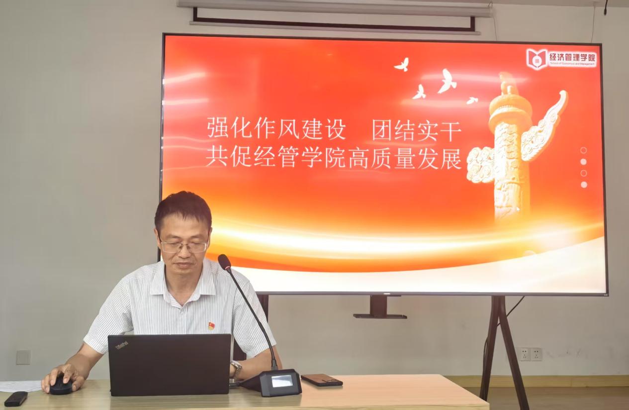 首先,经管学院党总支书记徐标作题为 “强化作风建设,团结实干,共促经管学院高质量发展” 的专题汇报。汇报围绕本年度深入贯彻中央八项规定精神学习教育开展情况,重点通报了查摆问题清单及集中整治情况。经全面排查,学院梳理出领导班子责任担当不足、实验实训管理精细化程度欠缺、服务师生质量有待提高等问题。针对上述问题,学院坚持问题导向,迅速制定整改方案,明确责任人和整改期限,以刀刃向内的勇气推进问题整改落实。同时,徐标号召全体教职工,尤其是党员教师充分发挥先锋模范作用,以作风建设为引领,凝心聚力、团结奋斗,共同谱写经管学院高质量发展的新篇章。