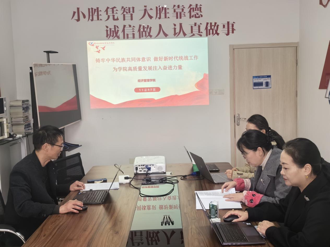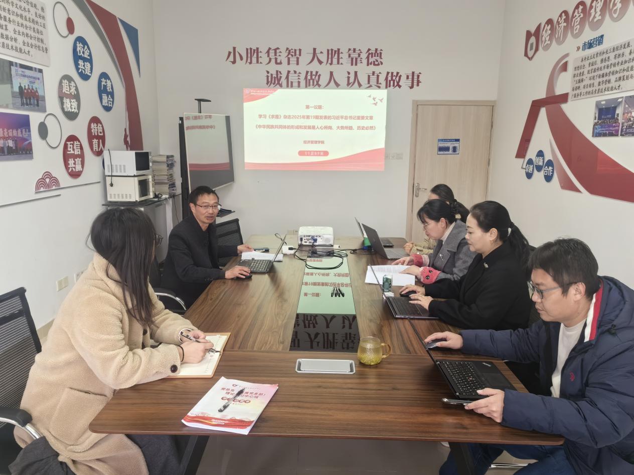 为深入学习领会习近平总书记关于铸牢中华民族共同体意识的重要论述,全面贯彻新时代党的统一战线工作相关要求,以高质量统战工作凝聚学院高质量发展的强大合力,11月27日,经管学院党总支理论学习中心组开展本年度第十一次集体学习。党总支委员、班子成员、两办主任、教研室主任参加了本次学习,学习会由党总支书记徐标主持。